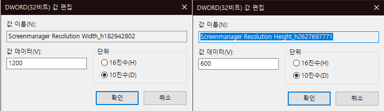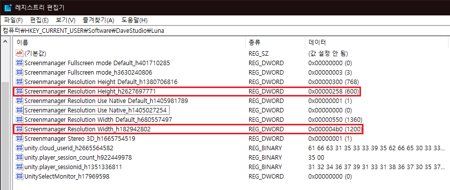 Screenmanager Resolution Height_h(숫자) 항목과 Screenmanager Resolution Width_h(숫자) 항목을 찾아주세요.