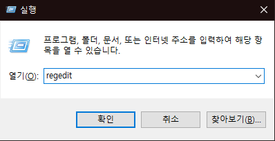 1. 시작 키를 눌러서 검색하시거나 윈도우키+R를 눌러 실행창을 여신뒤 regedit을 검색합니다